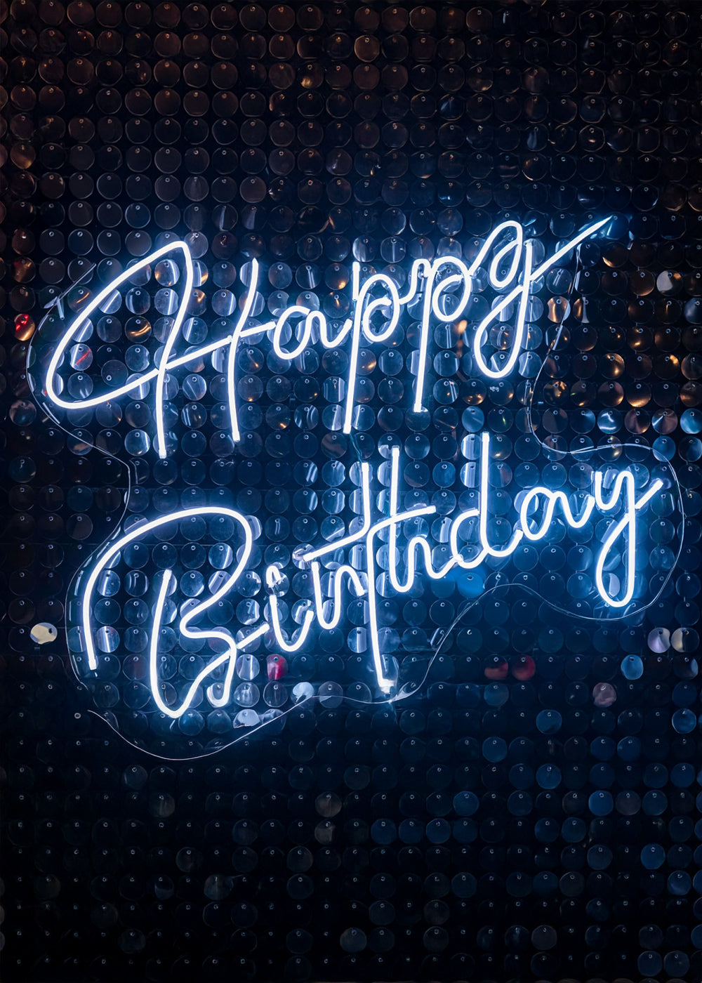 Pair your chosen backdrop with a touch of personality and mood to match your event! Whether it’s a bold phrase or a glowing name, they draw attention and give your space a sense of fun and individuality.